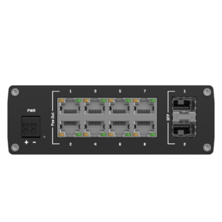 Industrial unmanaged PoE+ switch with 8× Gigabit PoE+ ports and 2× SFP fiber ports. Switch-only package (no PSU) for flexible power supply selection